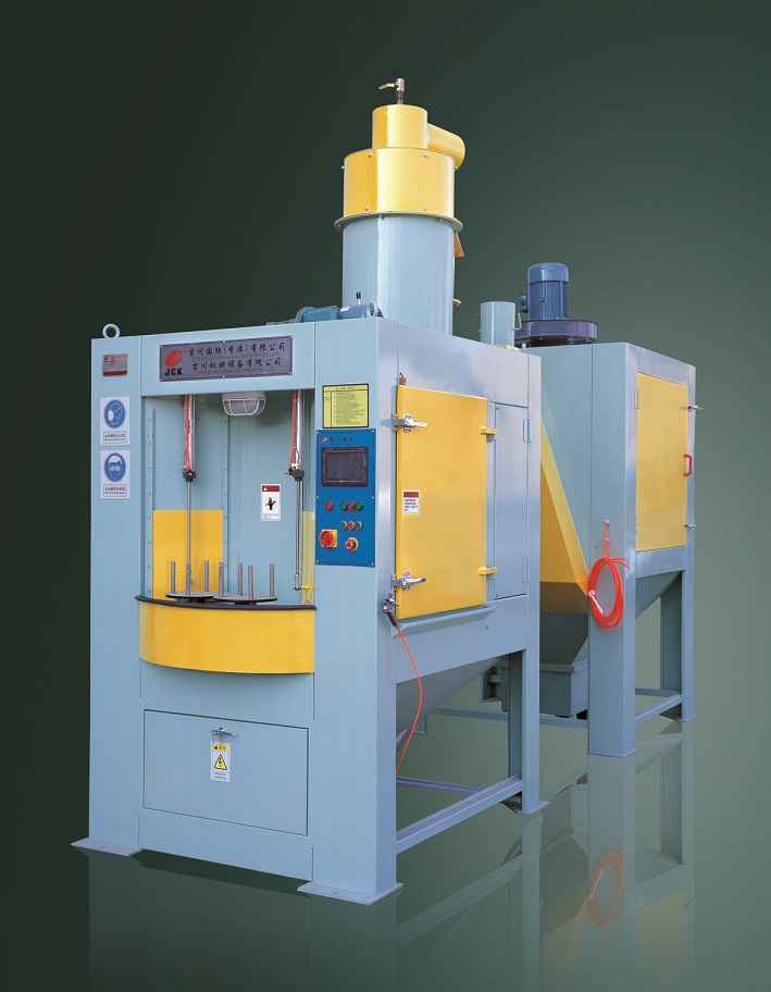 本設(shè)備是根據(jù)我公司針對轉(zhuǎn)動軸和處理要求而專門設(shè)計的轉(zhuǎn)盤式自動噴砂機,完全適合貴公司所提供的產(chǎn)品。根據(jù)貴公司對產(chǎn)品效率的要求,本機共大轉(zhuǎn)盤共設(shè)置4個區(qū)域(90度一個區(qū)域),每個區(qū)域設(shè)置2個工件裝夾工位。大轉(zhuǎn)盤每轉(zhuǎn)動90度區(qū)域一停,噴砂區(qū)域內(nèi)共布置12支普壓高速噴砂槍,在噴砂區(qū)1個區(qū)域 2個噴砂加工位,各布置6支噴砂槍對工件需噴砂部位做擺動噴砂加工,噴槍可根據(jù)加工需要,隨意調(diào)整其噴射角度,其自動化程度較高。 該機由主機、旋風分離器、除塵箱、抽風管道、空氣壓縮系統(tǒng)(客戶自備)、電氣系統(tǒng)等組成。本機配置12支普壓高速噴砂槍,根據(jù)工件的大小可擺動噴砂,也可定點噴砂,靈活方便實用。